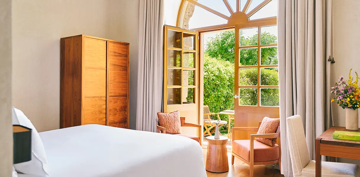 Habitación Doble Clásica con jardín, desde 30 m2, con una cama Queen Size (1,80 x 2,00 m.), diseñada para su máximo confort y con maravillosas vistas a los viñedos de Abadía Retuerta.