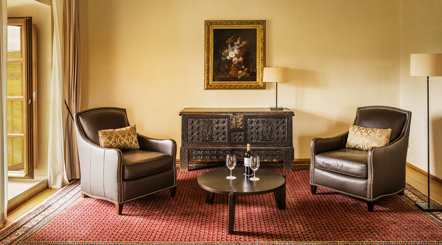 Habitación Master Suite, desde 100 m2, diseñada para su máximo confort y con maravillosas vistas a los viñedos de Abadía Retuerta. Se compone de una habitación doble con cama King Size (2,00 x 2,00 m.), salón, vestidor, aseo y baño de mármol de Carrara, con ducha y bañera separadas.